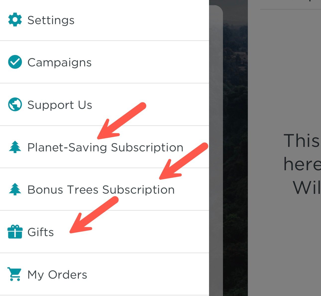 - Purchase Gifts, a Planet-Saving Subscription, or Bonus Tree Subscription in the app. Just touch the (vegan) hamburger menu icon in the upper left corner of the app, then choose what you want: